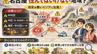 「名古屋住んではいけない地域」という話を聞くと、特定の地名だけを挙げて「ここはダメ」と決めつける情報が多いです。でも実際は、同じ区や同じ駅の近くでも、道を一本はさむだけで雰囲気がガラッと変わることがあります。さらに、昼と夜でも人の多さや周り...
